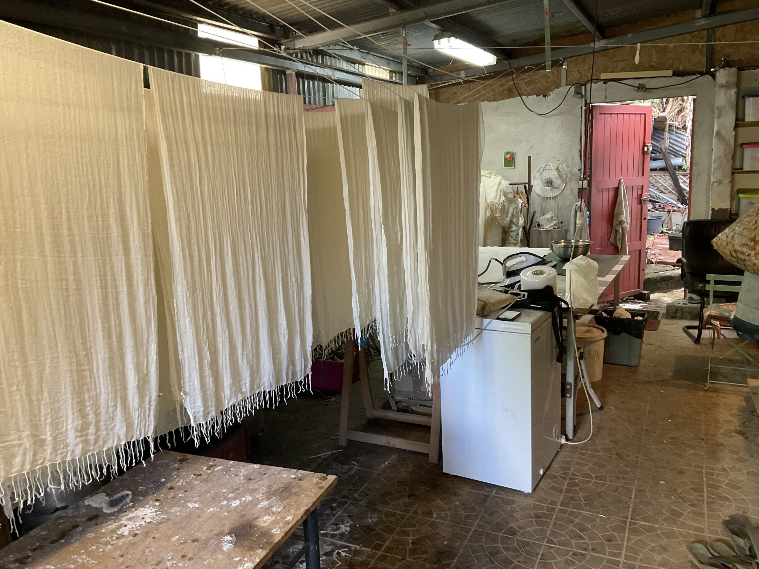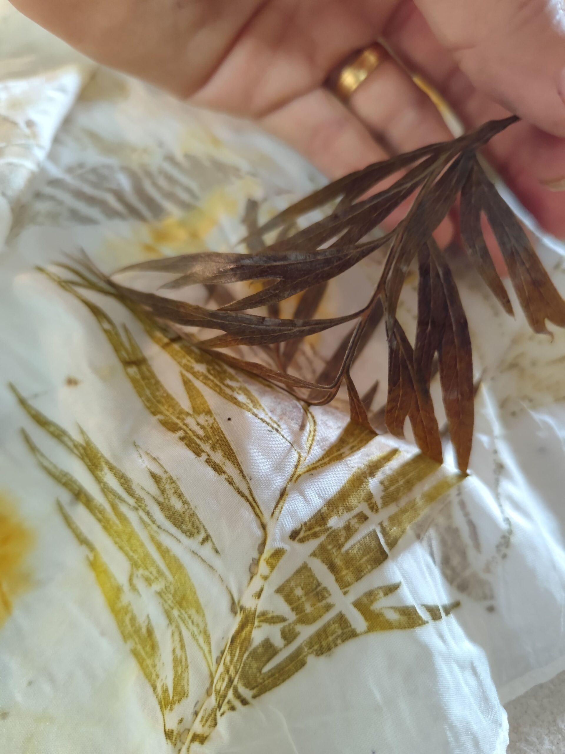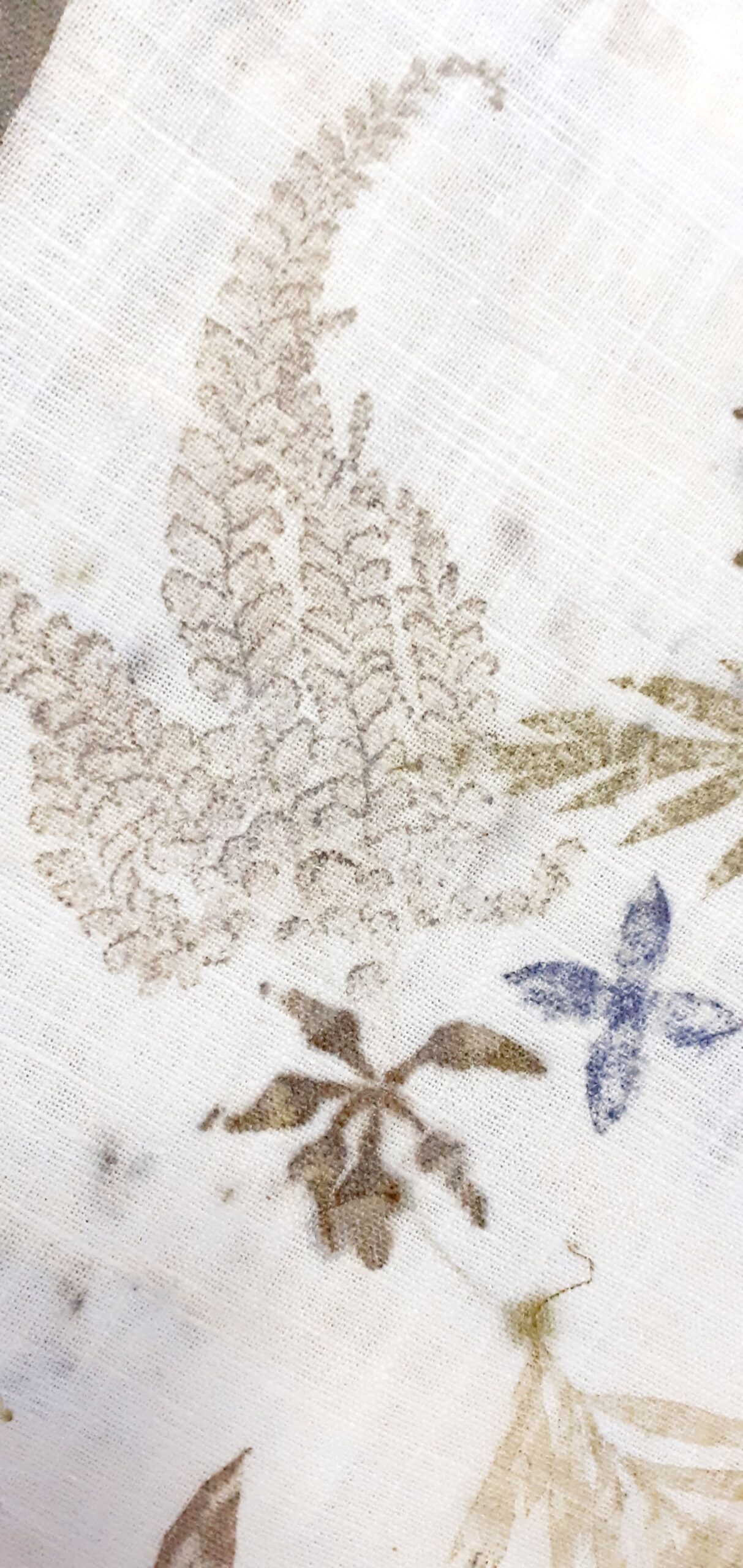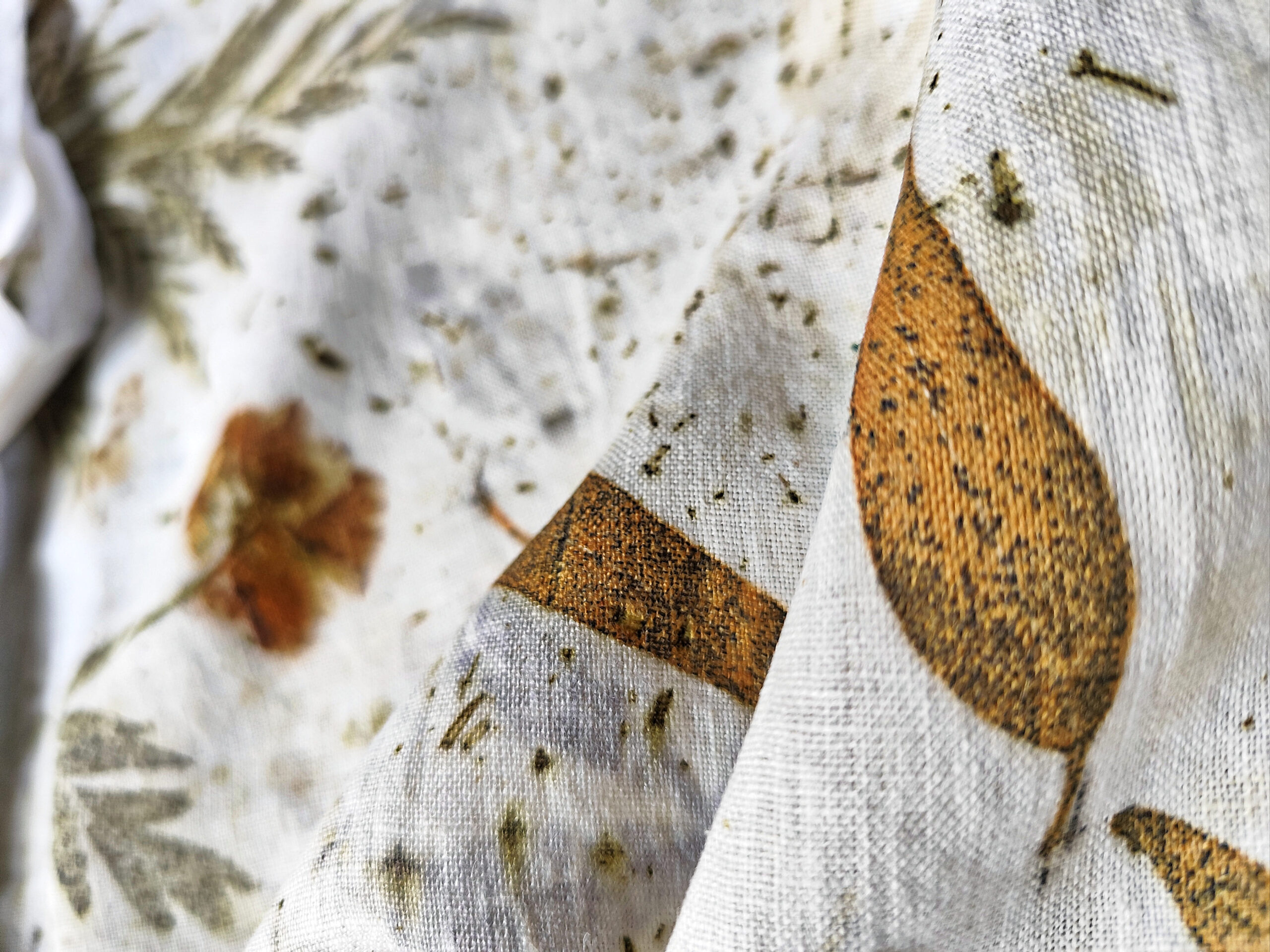 Soie, lin, coton indien peu gourmand en eau, mais aussi vêtements de seconde main : les supports racontent eux aussi une histoire de sobriété et de renaissance. Les feuilles sont disposées sur des tissus préparés, roulés, ficelés, puis passés à l’étuve, où la chaleur fixe les couleurs. Une fois révélées, les étoffes deviennent vêtements ou pièces uniques.
