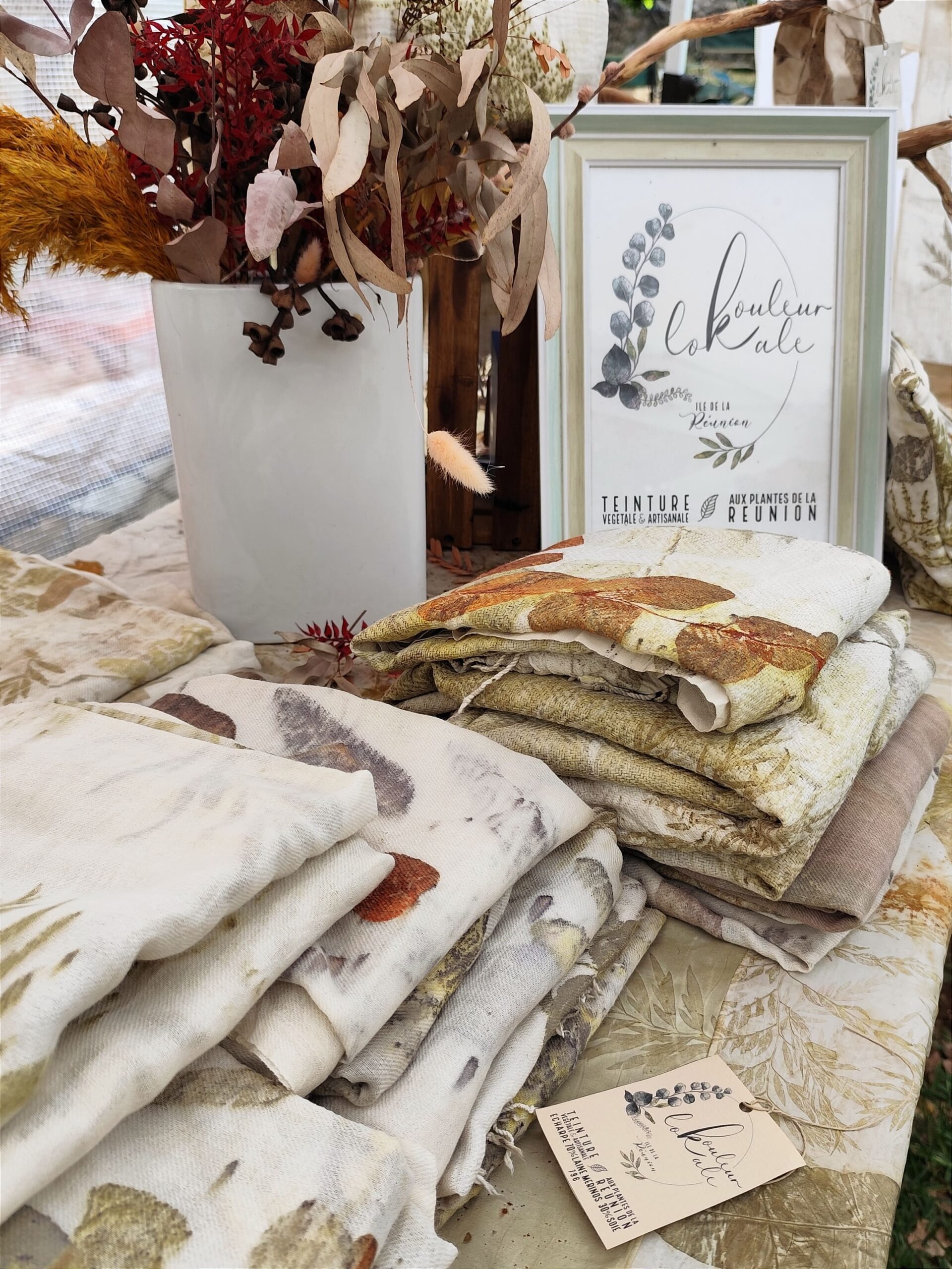 Avec Kouleur Lokale, Sonia Fulsunge a fait du végétal une encre et du tissu une mémoire. Installée à La Réunion, elle développe une pratique délicate de teinture végétale et d’écoprint, où feuilles et fleurs viennent s’imprimer directement sur la matière. Grandie dans les Alpes, au plus près des paysages et des saisons, elle a conservé un regard attentif aux formes du vivant, aujourd’hui transposé dans ses créations textiles.