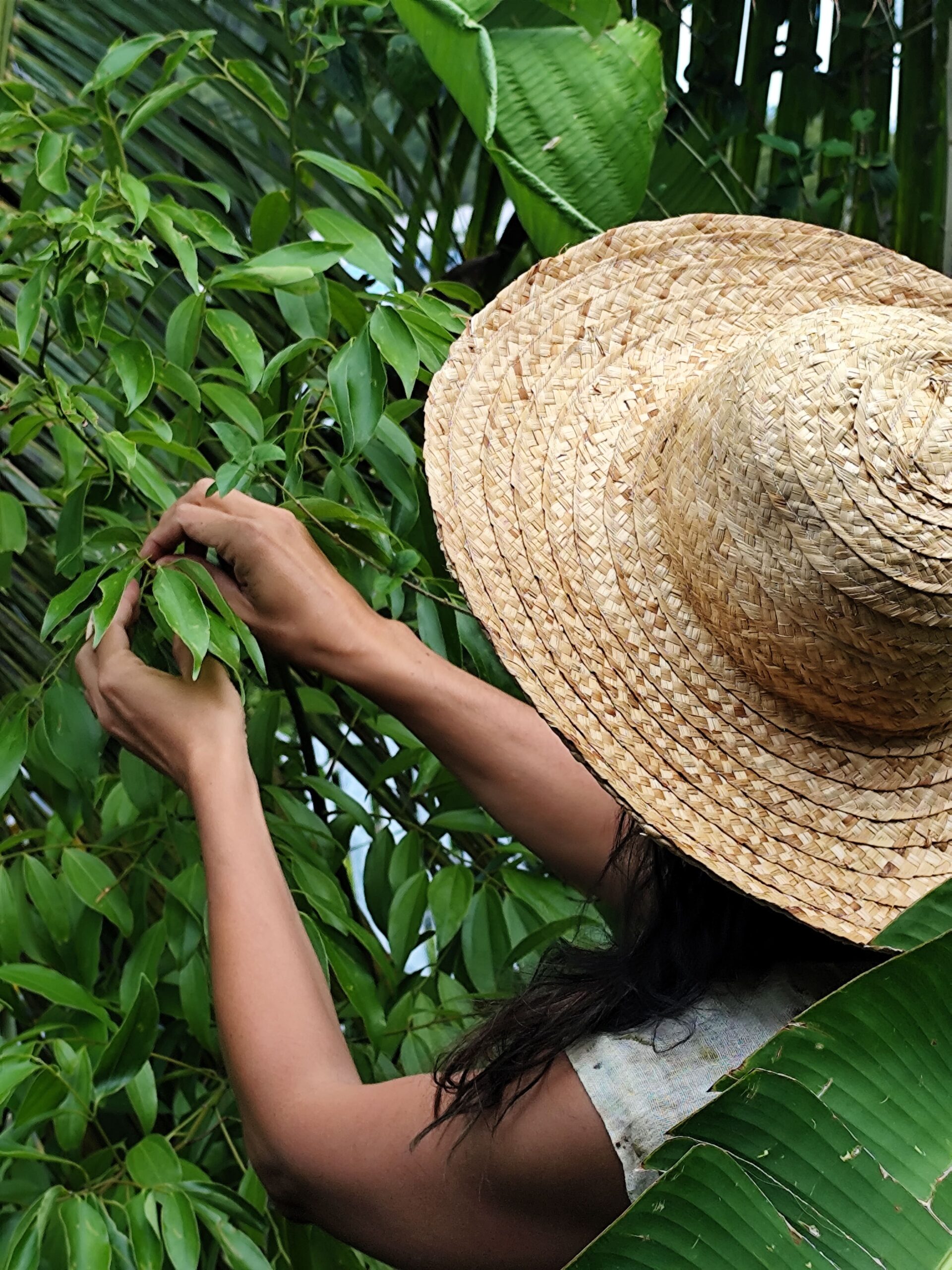 Sonia récolte exclusivement à La Réunion, du jardin familial aux arbres de l’espace public, comme les eucalyptus de l’Étang-Salé. Endémiques, indigènes, exotiques ou envahissantes : ses cueillettes répondent avant tout à la capacité graphique et chromatique des végétaux. Ce sont les nervures, les contours et les pigments qui guident ses choix, dans une quête d’empreintes nettes et vibrantes.