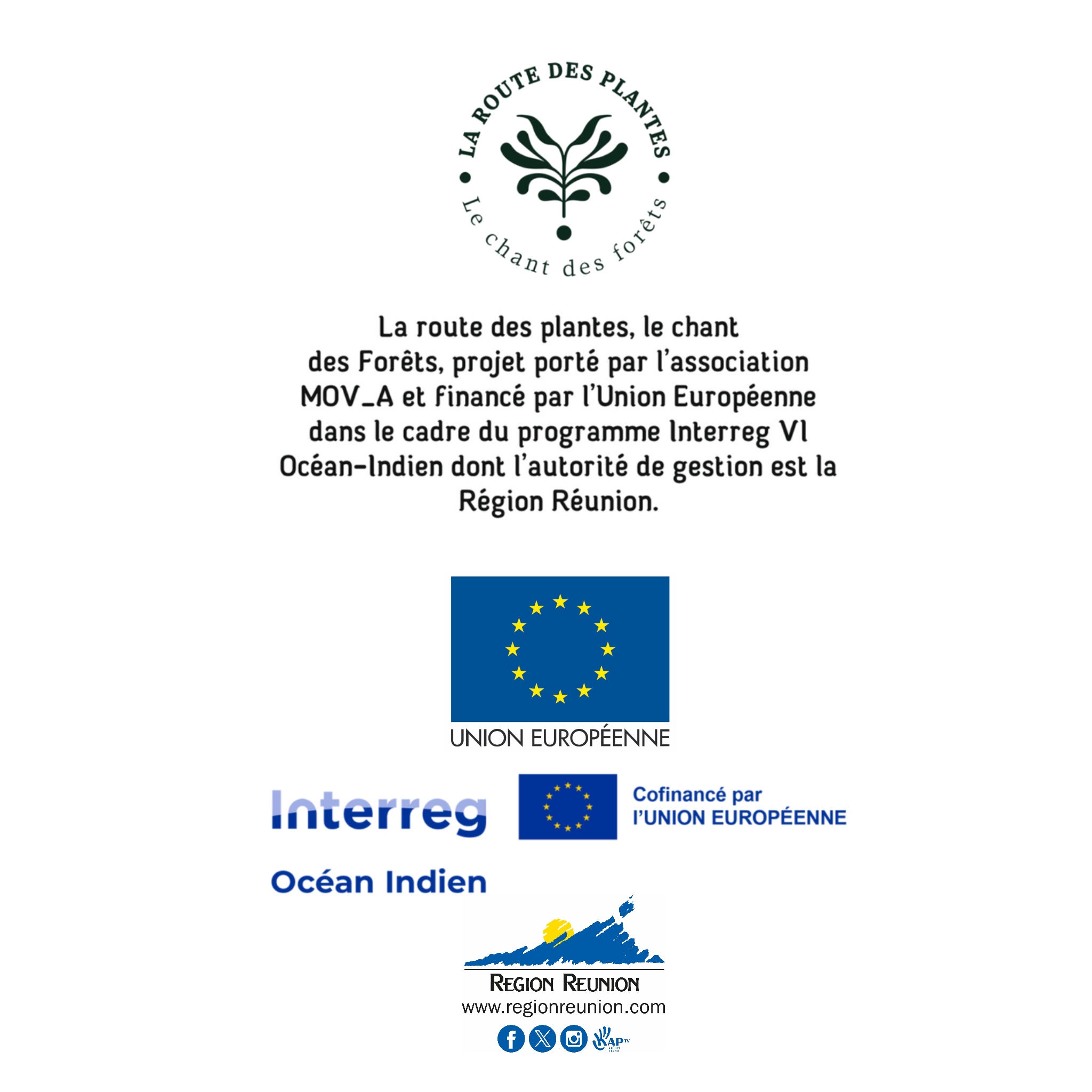 La Route des Plantes, le chant des Forêts, projet porté par l’association MOV_A et financé par l’Union Européenne dans le cadre du programme Interroge VI Océan-Indien dont l’autorité de gestion est la Région Réunion
