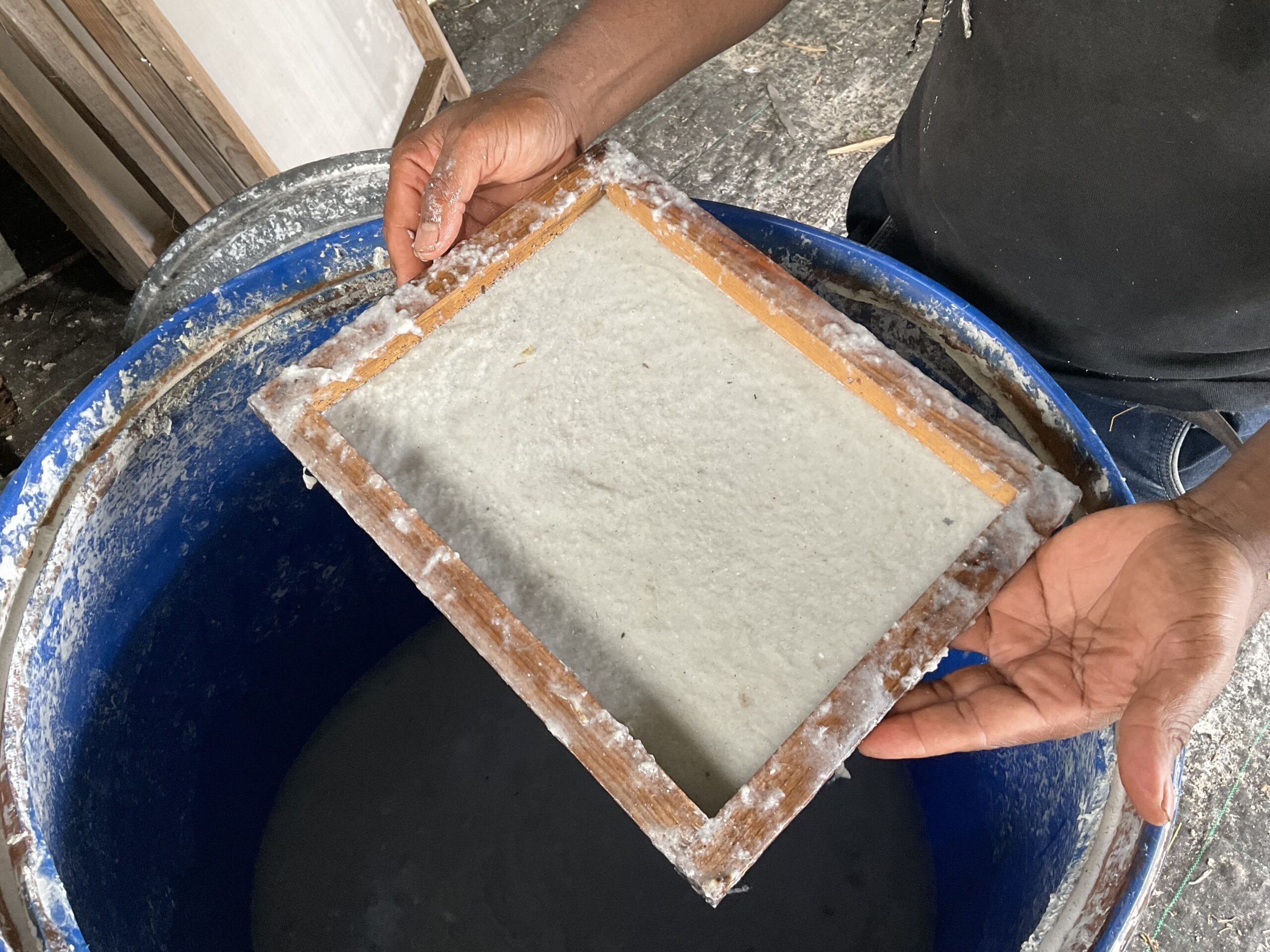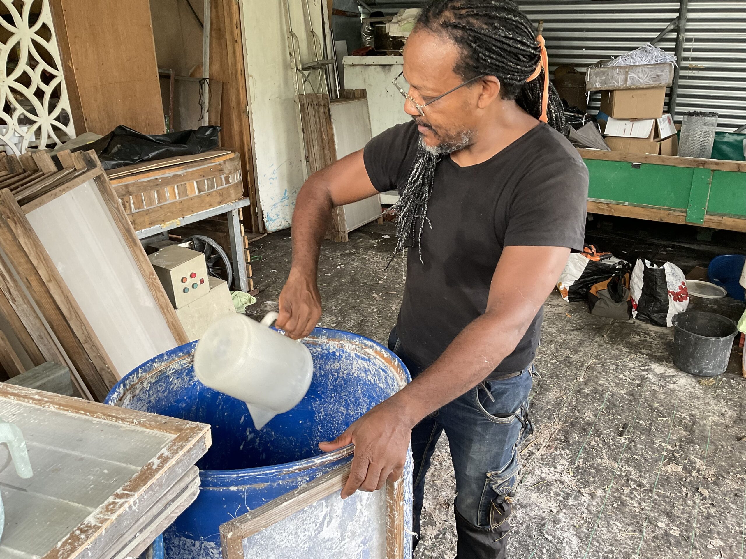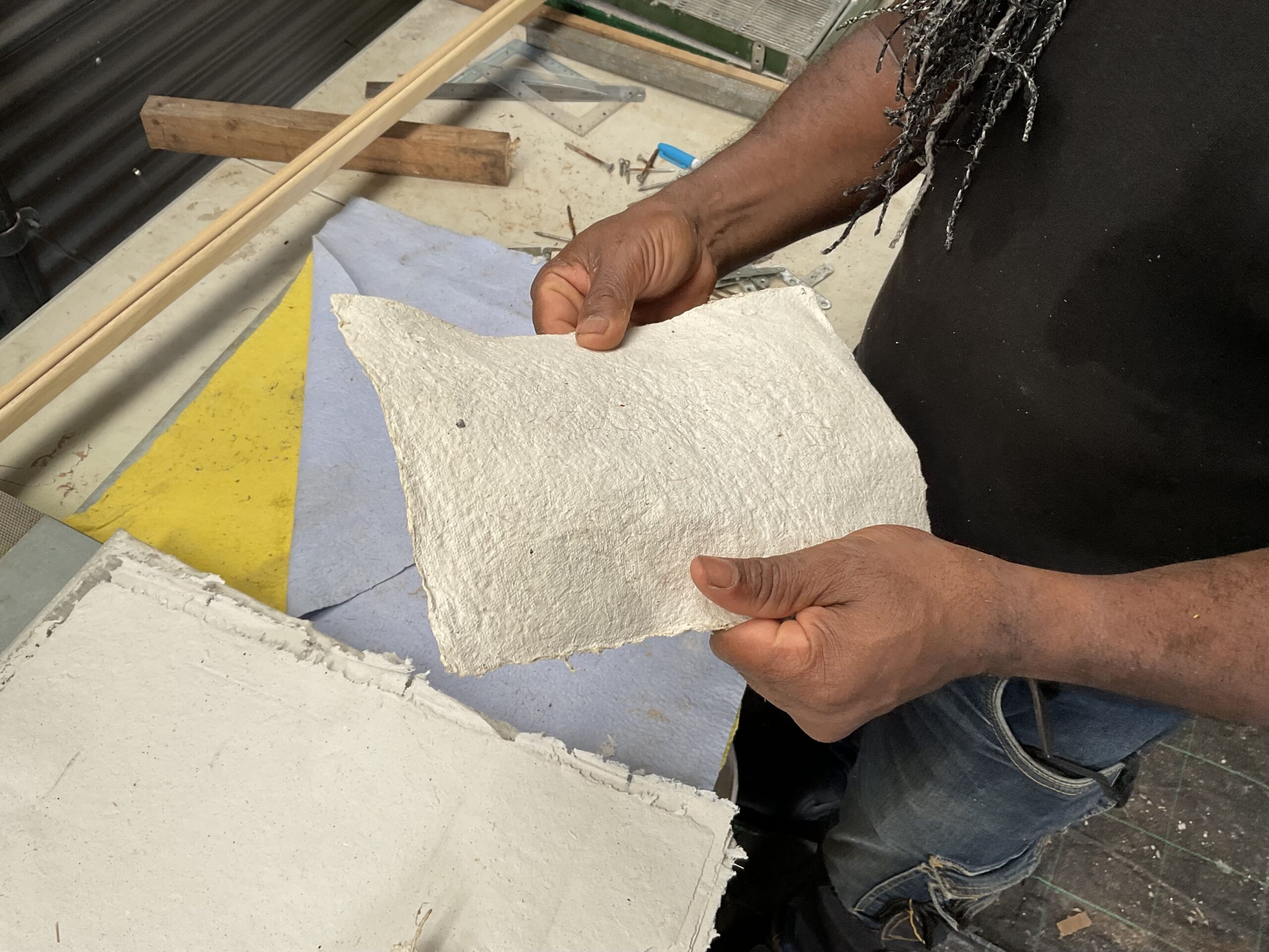 Ils mènent depuis des années un travail d’expérimentation autour du végétal : terre noire, charbon vert, briquettes, tressage, tissage… La fabrication du papier suit un processus précis — récolte, broyage, cuisson, macération, mise en suspension, tamisage — et les machines ont été pensées et construites par Gilbert lui-même, adaptées aux spécificités de chaque plante.