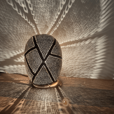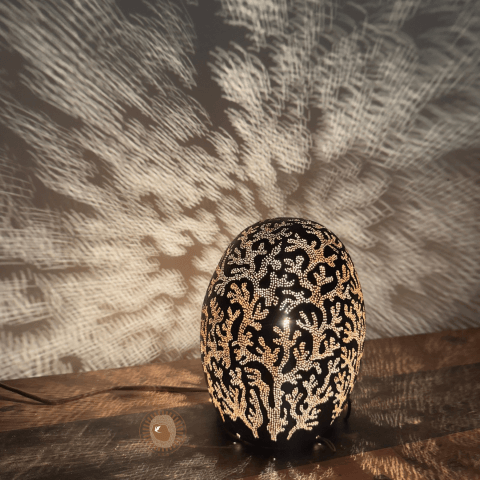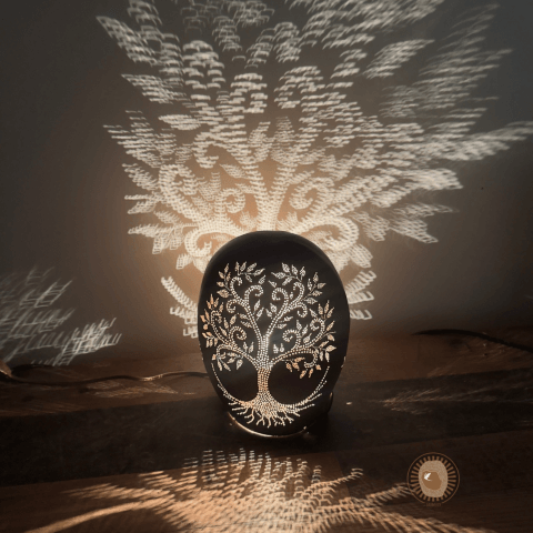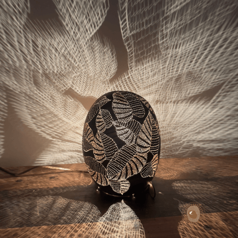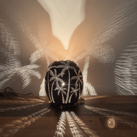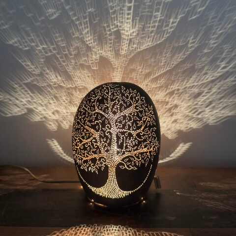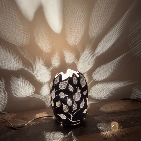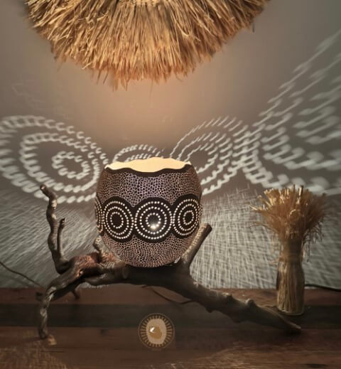 Son processus repose sur une technique minutieuse : évidage de la calebasse, tracé intuitif de motifs inspirés de la nature, perçage délicat à l’aide d’outils de précision, puis montage de l’alimentation électrique. Chaque fruit possède une forme unique qui guide la création. Elle produit en rythme avec le vivant, loin de toute logique de série ou de standardisation.