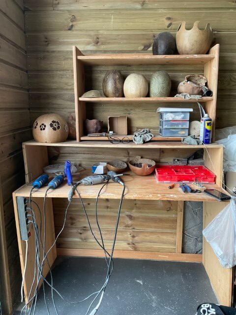 Elle découvre la calebasse en Guadeloupe, après avoir travaillé le bois flotté et les graines. Ce qui la fascine, c’est la capacité de la nature à offrir des formes et des matières déjà parfaites. Elle récolte ses calebasses à La Réunion, dans des jardins ou des espaces ouverts, et cultive également un jeune calebassier. Fidèle à une démarche sobre et respectueuse, elle ne les peint ni ne les vernit : la matière brute est laissée intacte pour révéler sa texture et sa couleur naturelles.