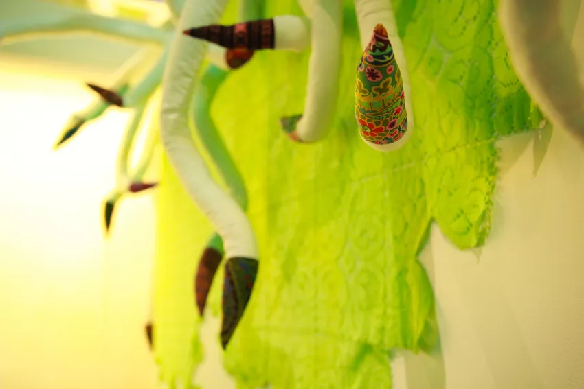 Le végétal n’est jamais décoratif ; il est partenaire. Son jardin devient un véritable laboratoire du vivant, un espace d’observation des rythmes, des métamorphoses et de la finitude. Les corps, humains et non humains, y sont pensés en interdépendance : ils se prolongent les uns les autres pour former un corps commun, une communauté terrestre. L’artiste récolte, assemble, bouture, coud et plante les fragments de cette communauté afin de nous inviter à la penser collectivement.