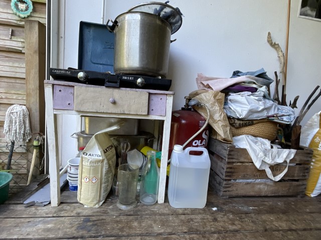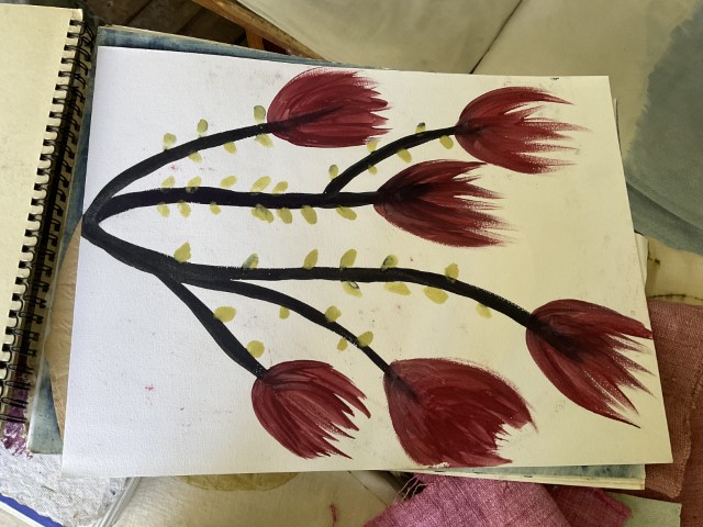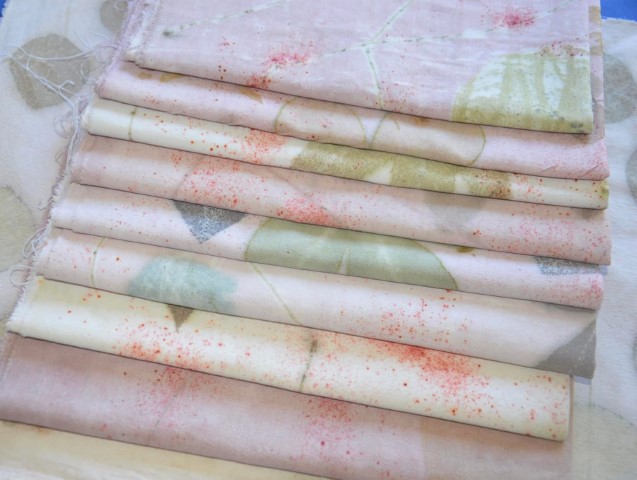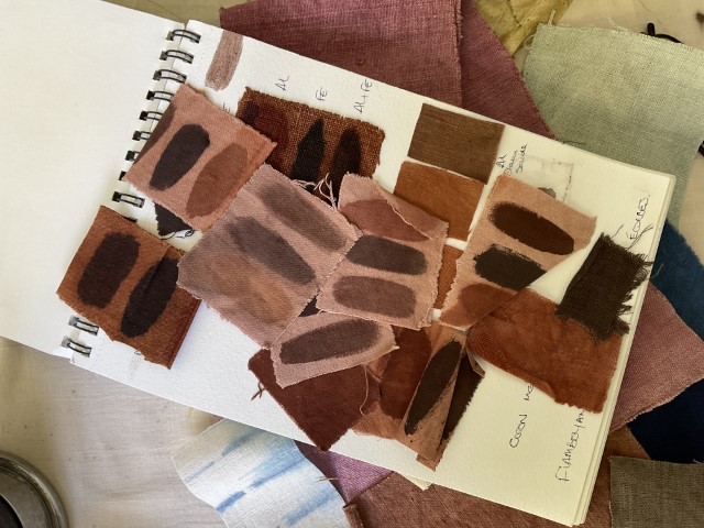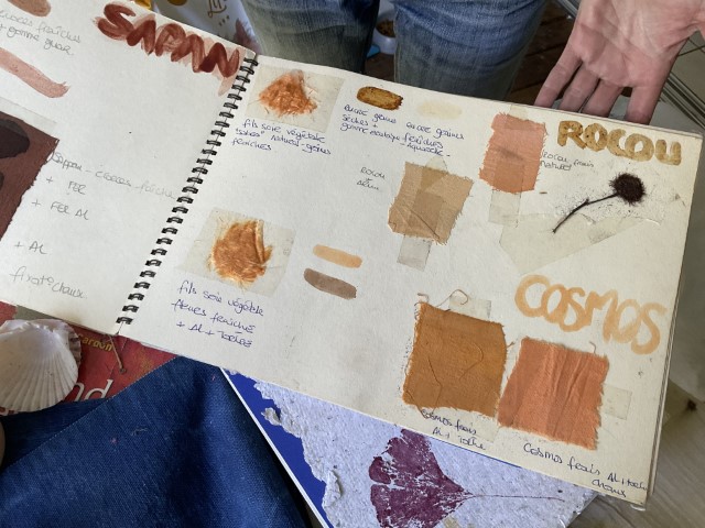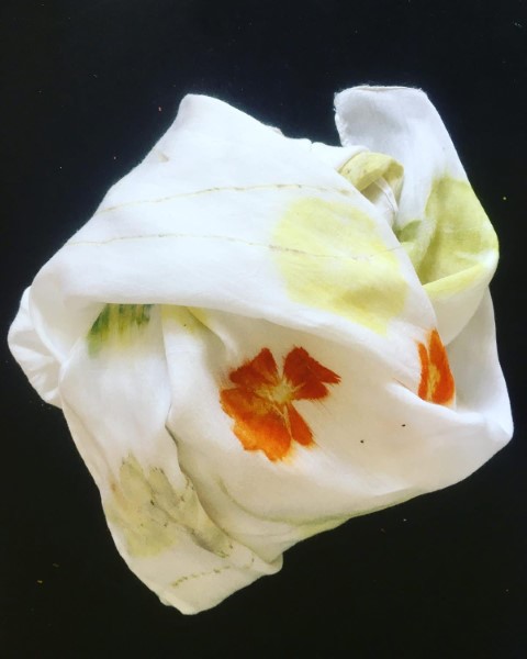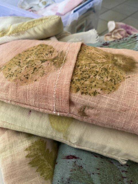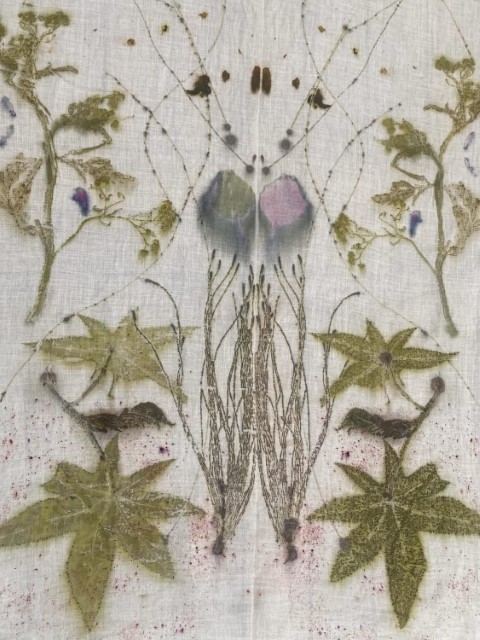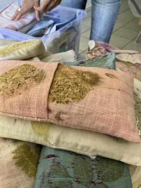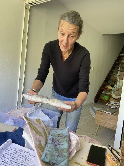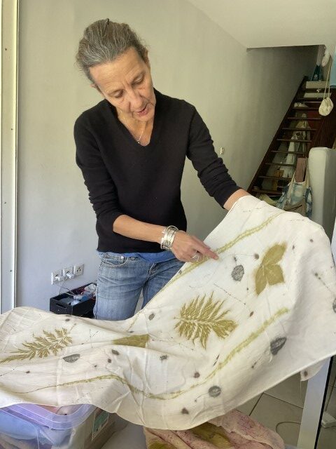 Dans son travail, chaque plante est une rencontre. Certaines feuilles restent intactes, pressées contre le tissu pour révéler l’empreinte exacte de leur nerf, de leur souffle. D’autres bouillent, se dissolvent, s’abandonnent dans des bains de chaleur et de patience. Les étoffes — étoles, écharpes, sacs, vêtements, deviennent des paysages de fibres où la lumière dépose sa propre mémoire. Valérie dialogue avec des chercheurs, des artisans, des compagnies de danse et de théâtre ; elle teint des costumes, accompagne des projets, glisse ses couleurs dans des créations intimes et collectives.