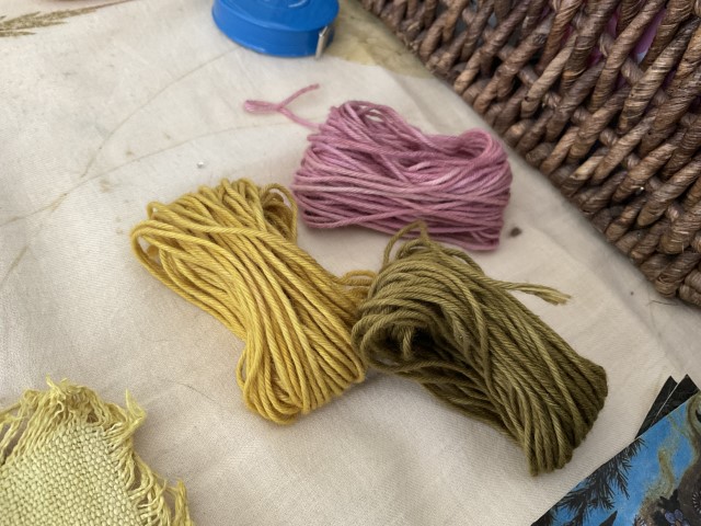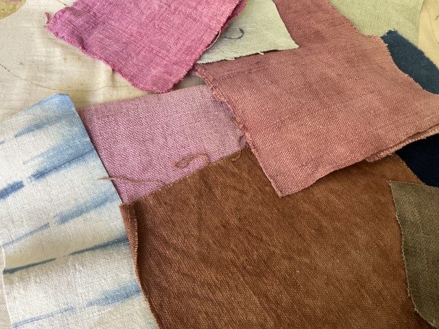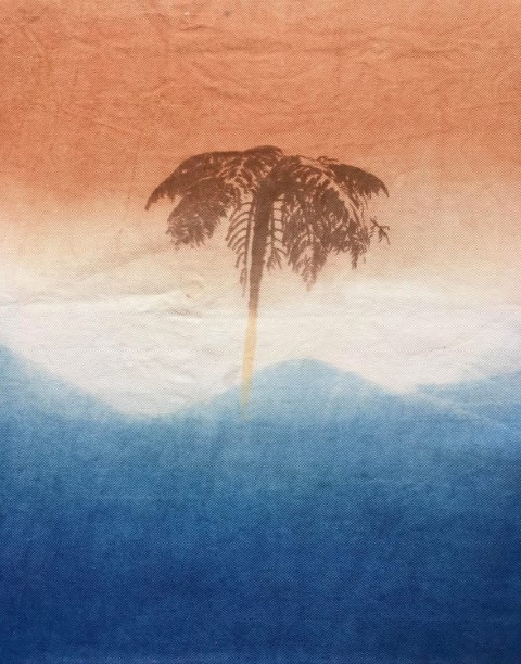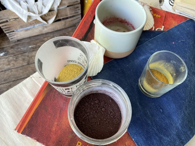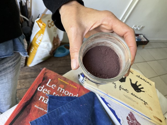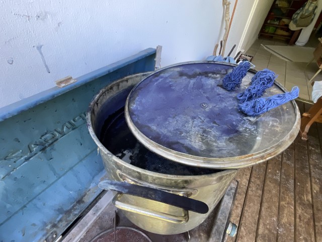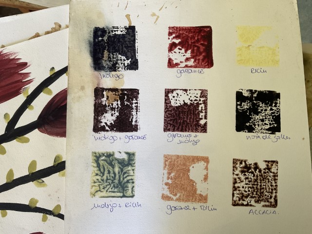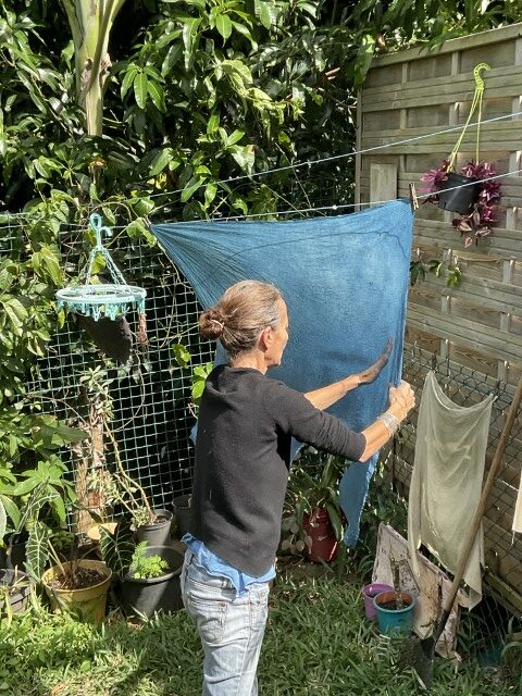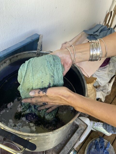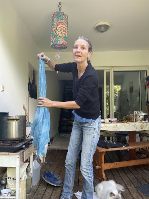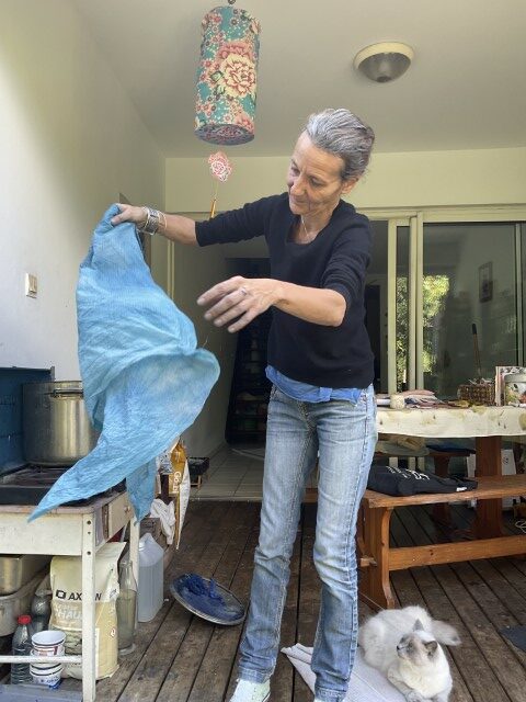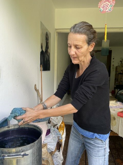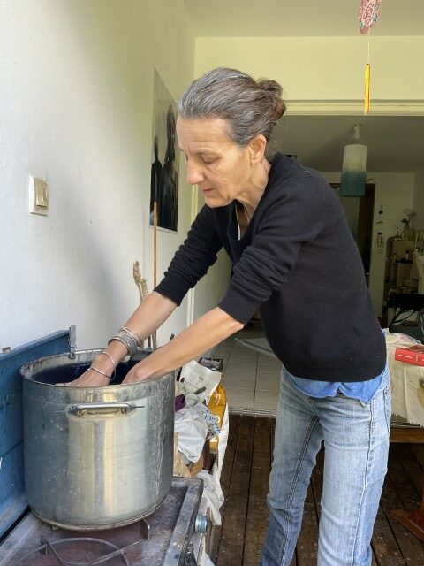 Valérie travaille avec ce que la nature lui confie : une peau d’oignon, des feuilles tombées, un fragment de tamarinier, une racine que la terre lui tend. Elle connaît la patience du végétal, son obstination à transmettre. Ses pigments naissent d’ici, de l’île, mais aussi d’ailleurs — Madagascar, où elle a vécu douze ans, et où elle revient encore, guidée par une fidélité profonde envers les familles artisanes. Cette île, qu’elle porte comme une sœur, nourrit son geste et élargit sa palette. L’indigo venu de l’Inde complète ce paysage de couleurs migrantes, voyages intimes entre îles et continents.