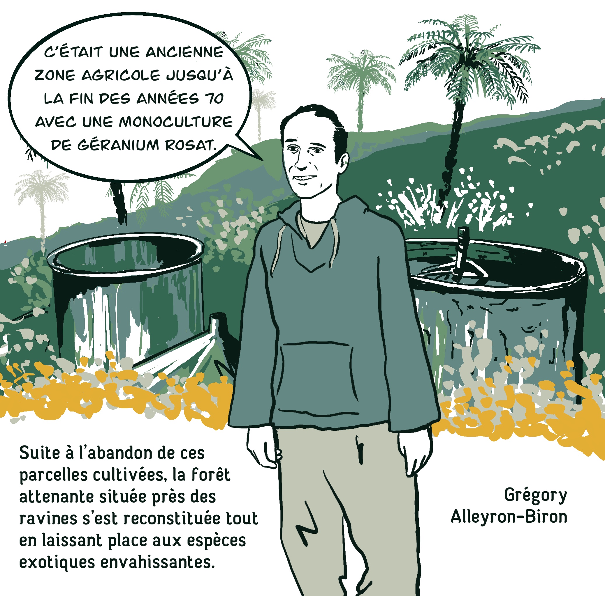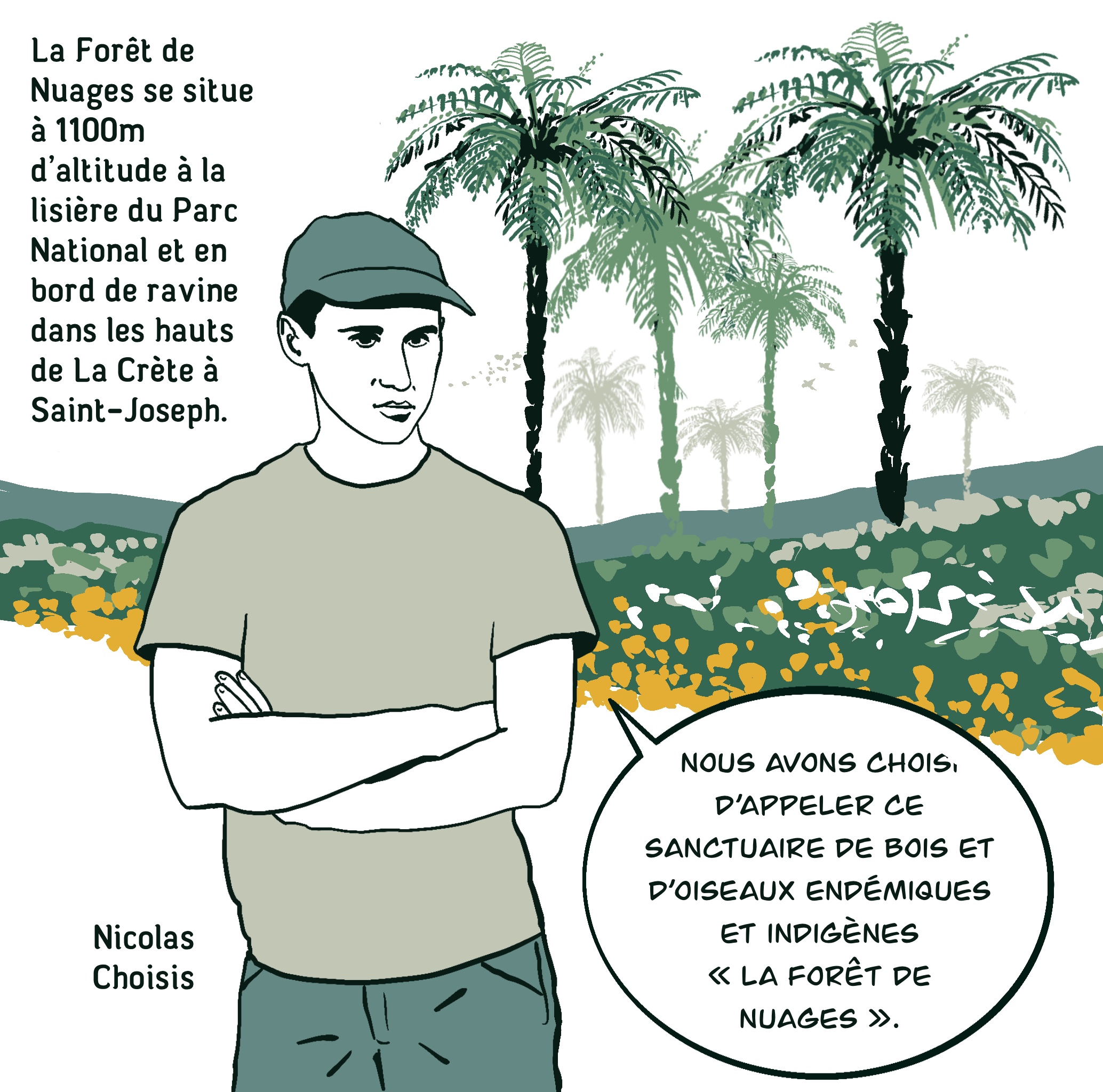La Forêt de Nuages se situe à 1100m d’altitude à la lisière du Parc National et en bord de ravine dans les hauts de La Crète à Saint-Joseph. Ancienne zone agricole jusque fin des années 70 avec une monoculture de géranium rosat qui est restée abandonnée pendant plusieurs décennies, la forêt située près des ravines s’est reconstituée au fil des ans tout en laissant place aux espèces exotiques envahissantes. La Forêt de Nuages est le nom qu’ont donné à ce sanctuaire de bois et d’oiseaux endémiques et indigènes que deux jeunes agriculteurs Nicolas Choisis et Grégory Alleyron-Biron, désormais les gardiens de cette forêt.
