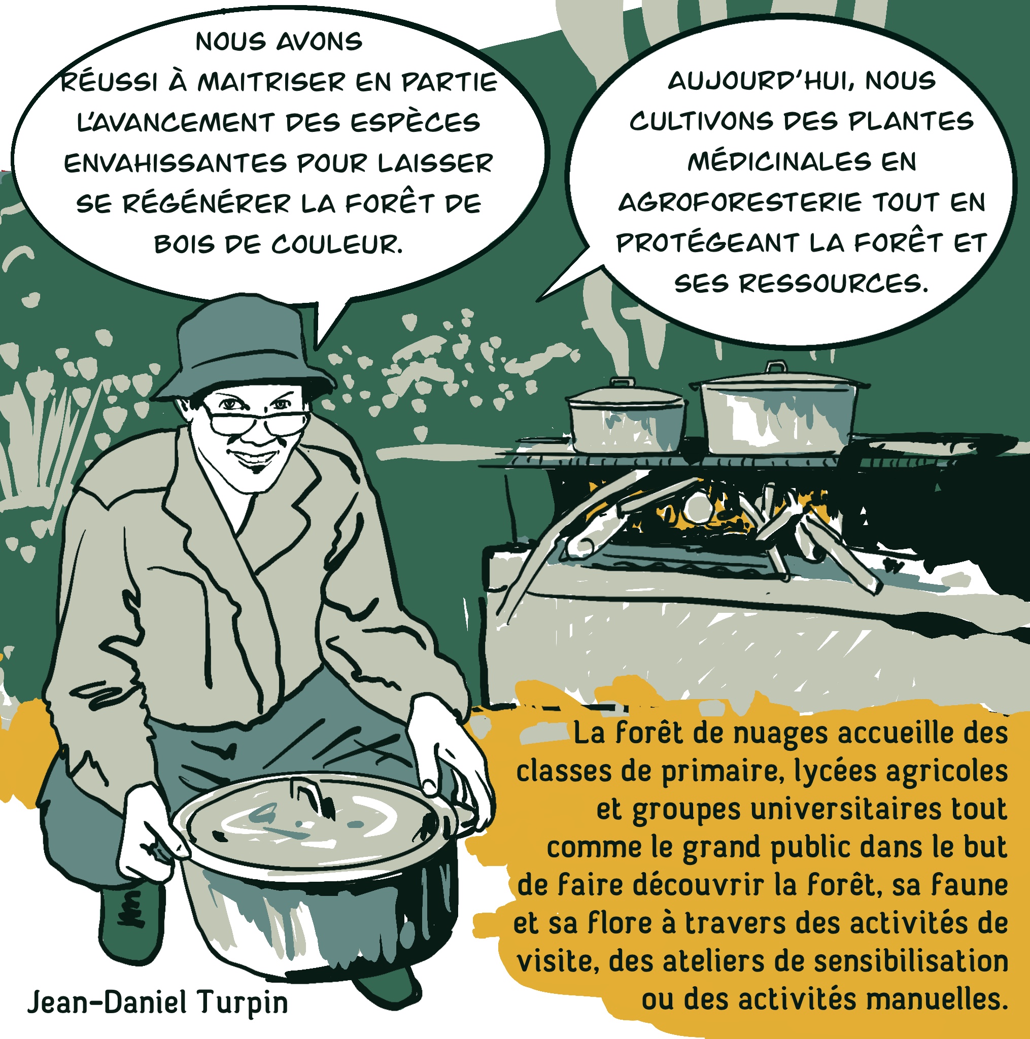 Aujourd’hui l’équipe a réussi à maitriser en partie l’avancement des espèces envahissantes pour laisser se régénérer la forêt de bois de couleur et cultiver des plantes médicinales et des pépinières en agroforesterie tout en protégeant la forêt et ses ressources.